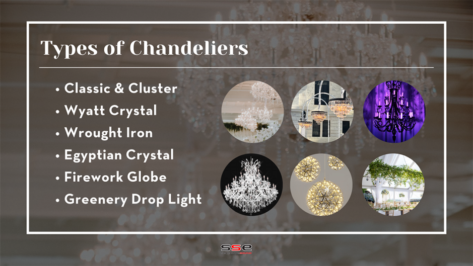 Egyptian Crystal – These elegant chandeliers will definitely make a statement at your wedding! Ideal in ballrooms and galleries, these chandeliers can also add grandeur and glamor to tents and more.