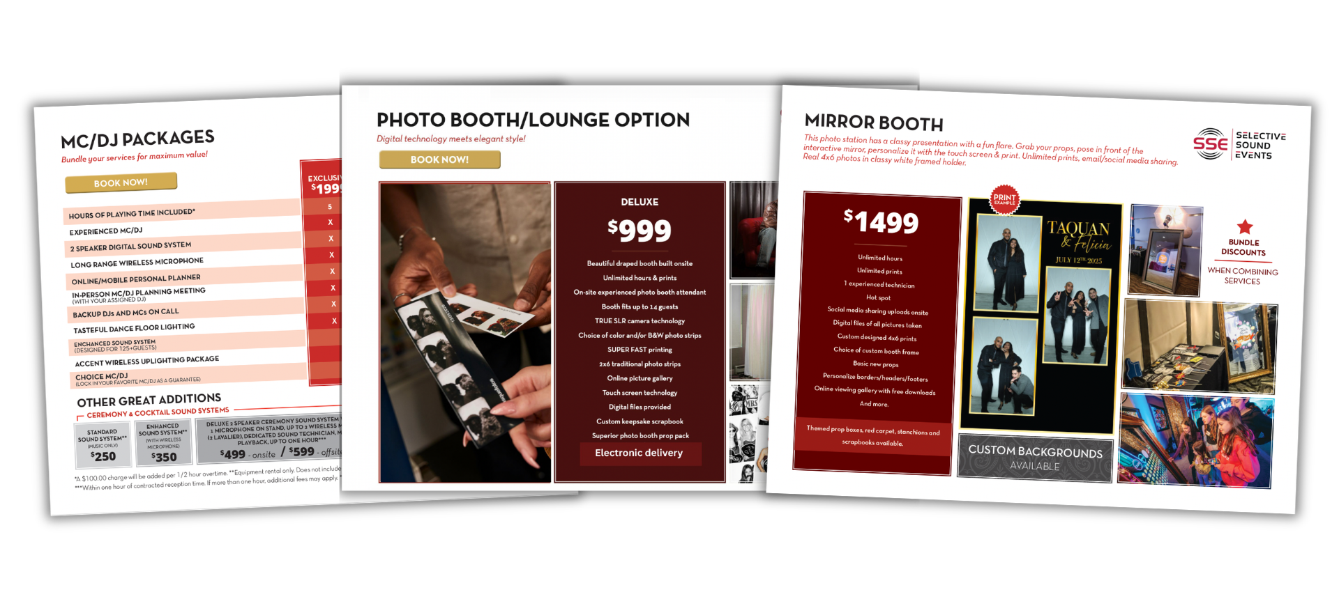 We offer a variety of package options for DJ/MC entertainment, photo booths, videography, and more. For pricing information on lighting & decor, please contact us, as each quote is custom!